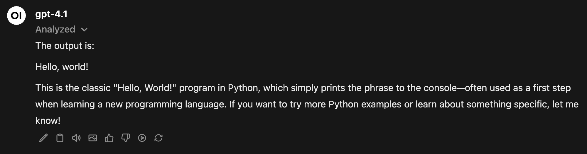 Hello World program. Make sure to click on the Code Interpreter area on your text input field.