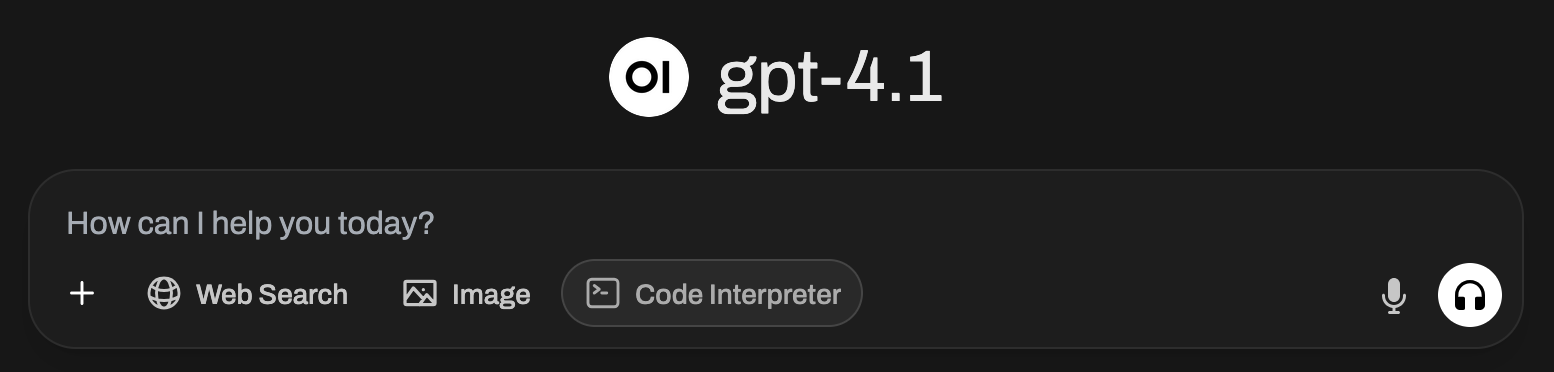 The first line of code we’re going to ask the AI to run is an obligatoryHello World program. Make sure to click on the Code Interpreter area on your text input field.